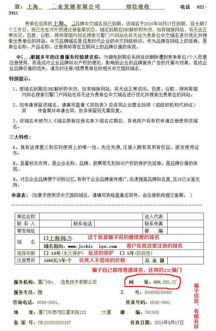 中文域名到期续费骗局的常用套路: